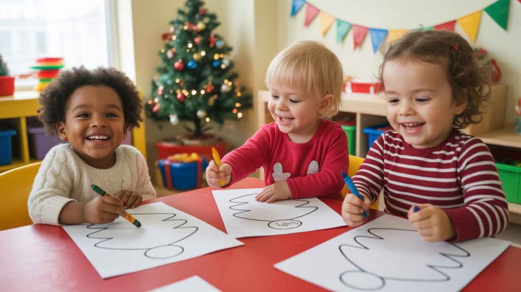 Preschoolers have shorter attention spans, so big shapes and fewer details are key. Try combining toddler coloring pages with December themes like ornaments, mittens, or gifts. They’ll be learning hand-eye coordination while having fun.