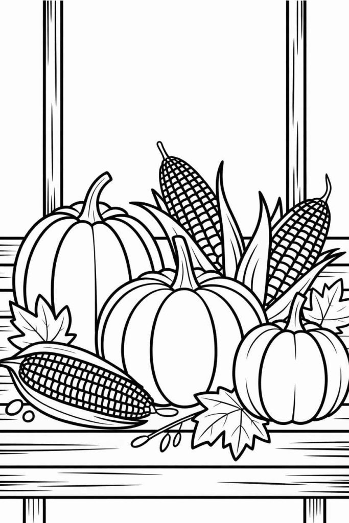 Fall Thanksgiving coloring pages for kids usually feature: