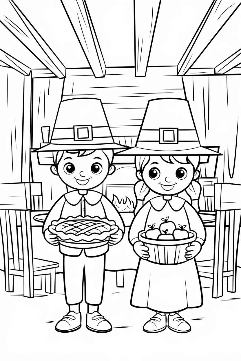 This depends on the source — but often it’s a pilgrim boy and girl coloring pages combo or a Thanksgiving feast scene in larger printable books.